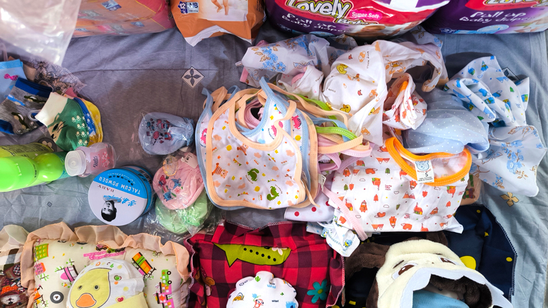 オムツのほか、服、エプロン、枕、靴下、ベビーパウダー、ベビーローション、ウェットティッシュ、枕、タオルなどを沢山寄贈いたしました。
