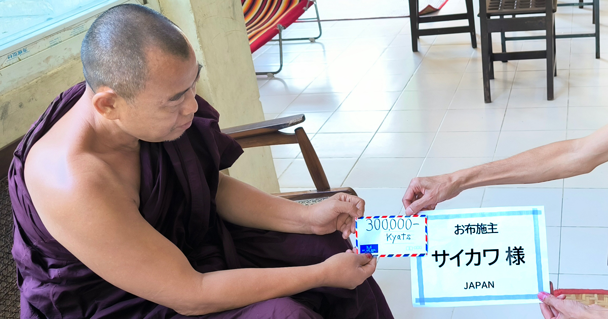 サイカワ様がヤンゴンにありますピーニャーミェーと言う仏教孤児院に施設運営費300,000チャットを寄進してくださいました。