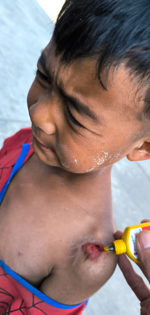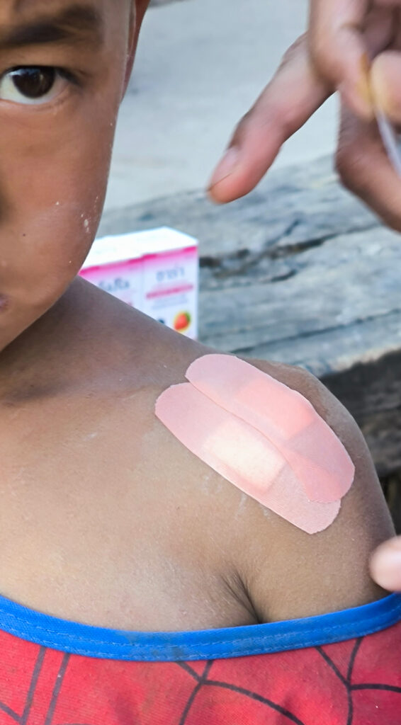早速、けがをした男の子がやって来たので応急処置をしてあげました。