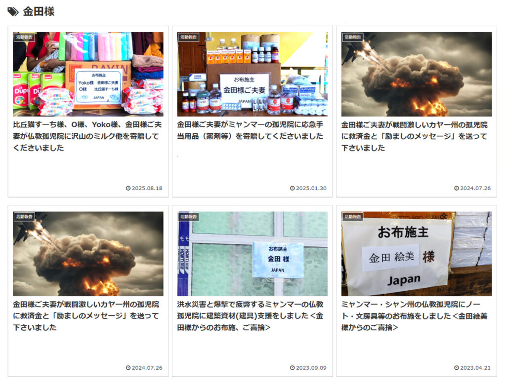 金田様ご夫妻からはミャンマー地震の時の救済を含め、これまでミャンマー各地に数え切れぬ援助を頂いております。