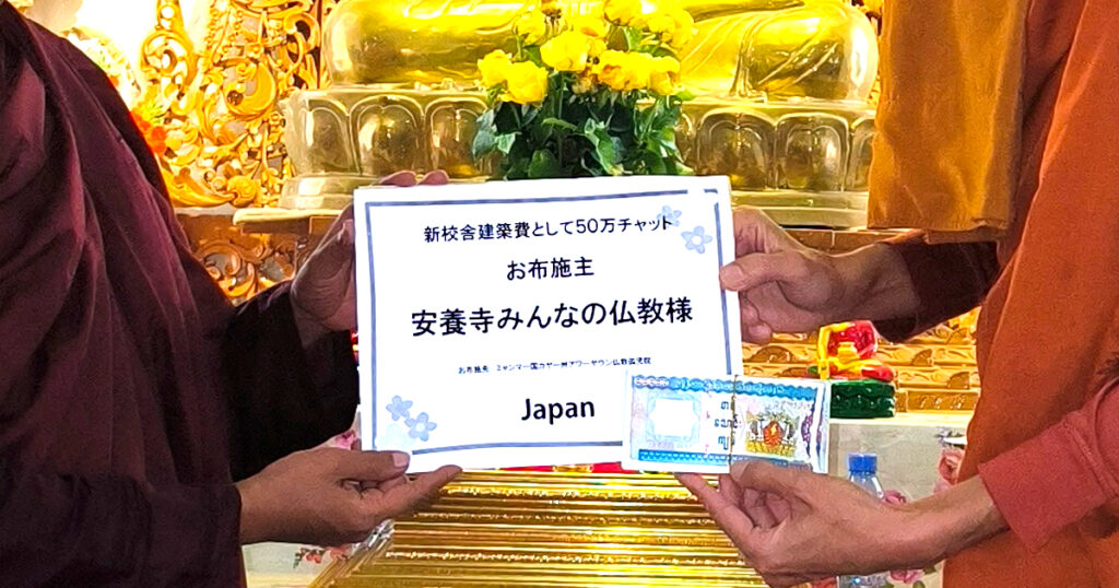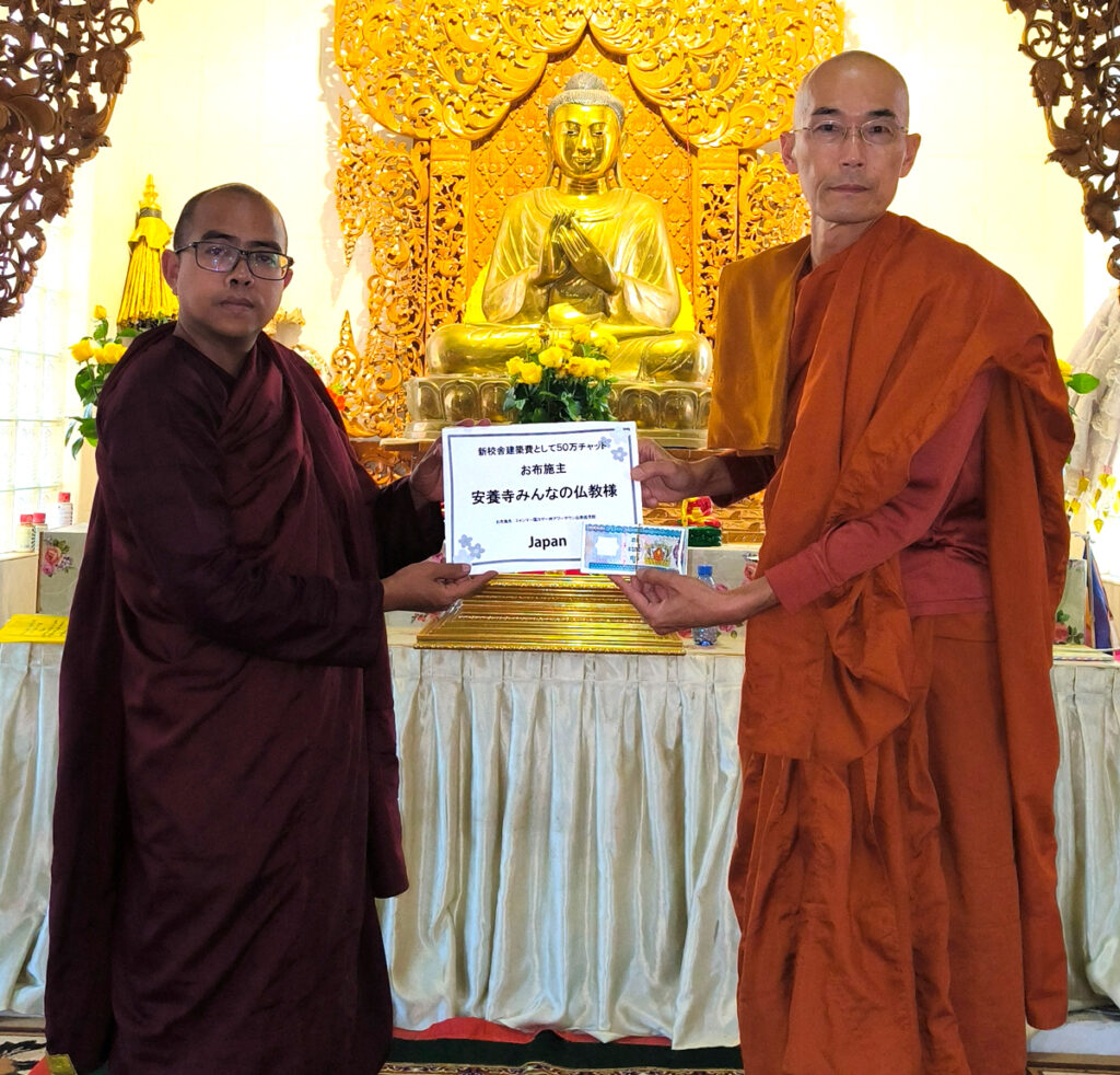 スジャータ子供支援活動では、「安養寺みんなの仏教様」からの建築費500,000チャットを和尚様にお布施させていただきました。