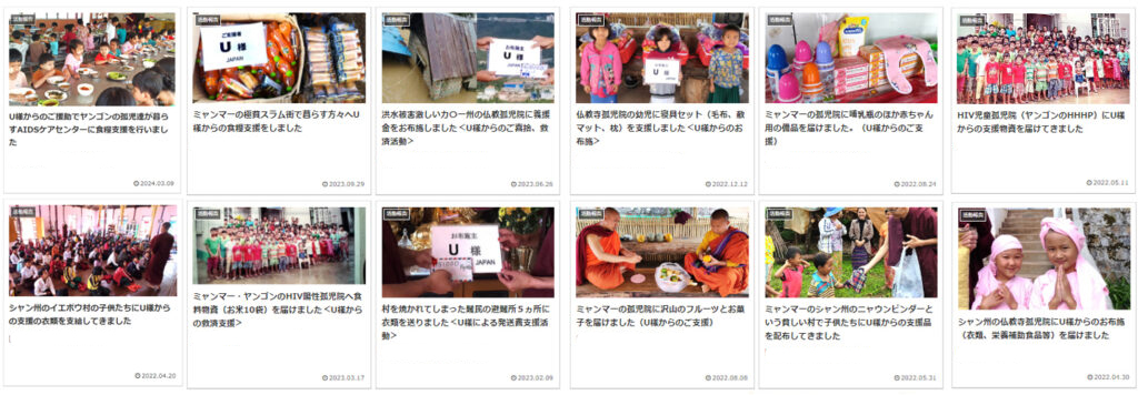 U様からは長年数えきれない救済をミャンマー各地の施設、人々に援助いただいております。またミャンマー大地震の時にも手厚い救済援助を頂きました、ありがとうございました。