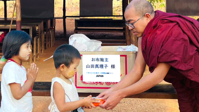 戦闘が行われているカ〇〇州の仏教孤児院で日本のお菓子を配りました<山田真理子様からのご寄附>
